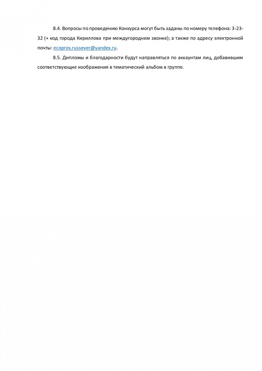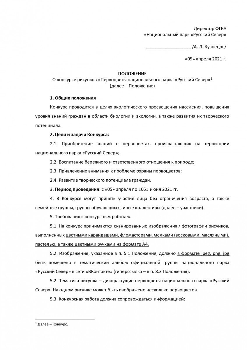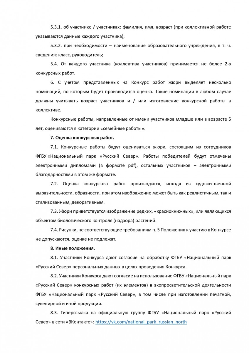 Ждем рисунки цветными карандашами, фломастерами, мелками и другими материалами, в электронном виде (сканированные изображения, фотографии). Конкурсные работы должны быть добавлены в специальный тематический альбом в официальной группе национального парка "Русский Север" в сети "ВКонтакте": https://vk.com/album-88314045_278628844