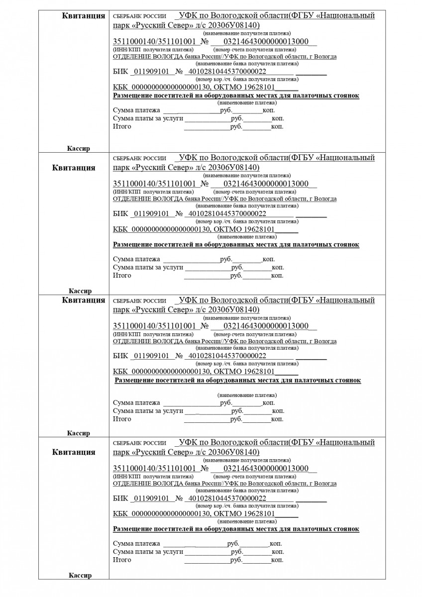 Ниже размещаем платежное поручение с обновленными реквизитами ФГБУ "Национальный парк "Русский Север" для оплаты пребывания на оборудованных стоянках в Сокольском бору.