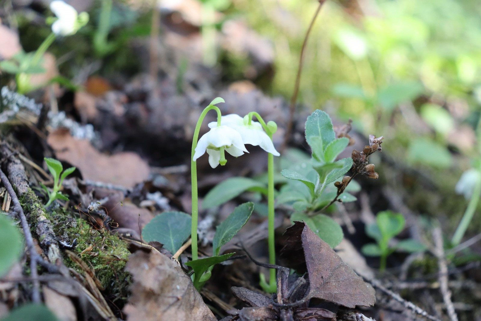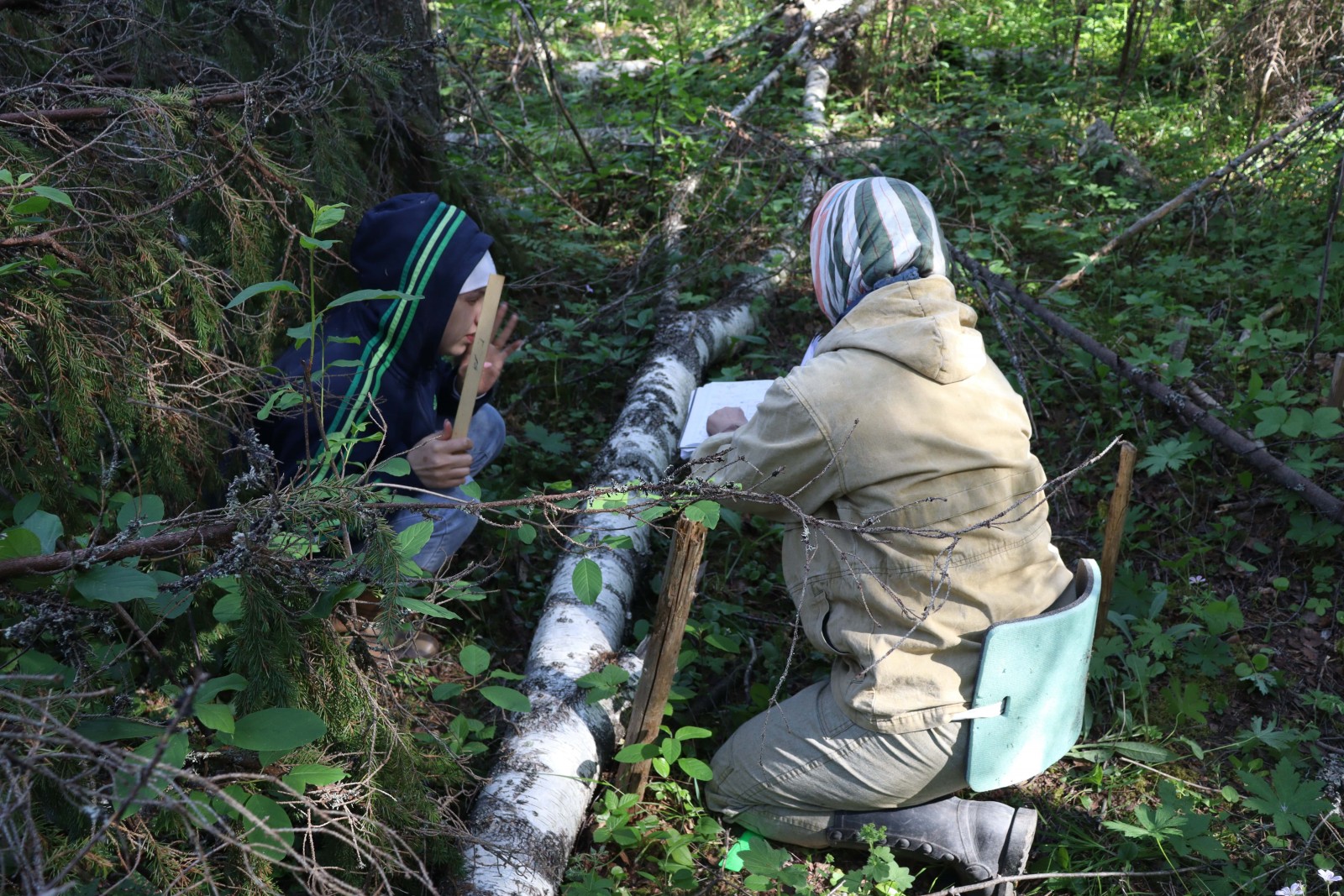 На фотографиях: начальник отдела организации природопользования и науки Л. В. Кузнецова, студентка Вологодского государственного университета Анастасия на пробных площадях; одноцветка одноцветковая (Moneses unifolra) – одна из «соседок» калипсо.