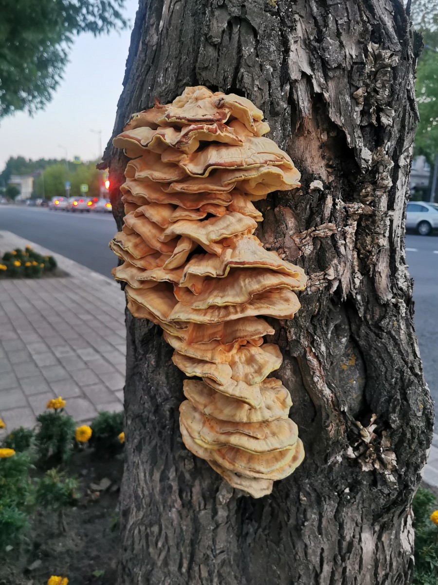 Любопытно, что в начале августа встретился нам и трутовик серно-желтый (в г. Череповце, в районе Советского проспекта). Пощупав эту природную «многоэтажку», мы удивились, какой, в отличие от климакодона, трутовик хрупкий и нежный.