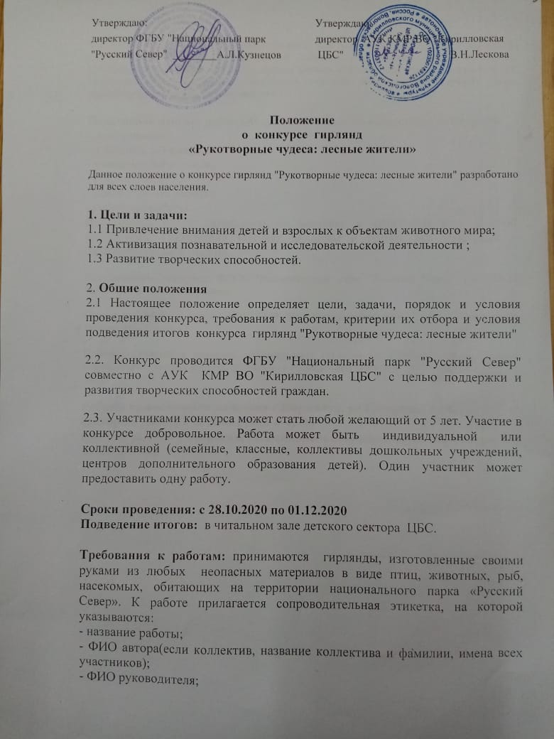 ФГБУ "Национальный парк "Русский Север" совместно с АУК КМР ВО "Кирилловская ЦБС" объявляет о проведении конкурса гирлянд "Рукотворные чудеса: лесные жители".