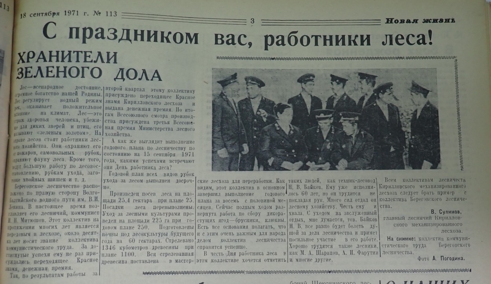 Изображения: публикация в газете «Новая жизнь» (вып. № 113 (6184) от 18.09.1971), фотография (тренировка по таксации в дер. Топорня, 1992 г.), предоставленная ООО «Северное лесоустроительное предприятие».