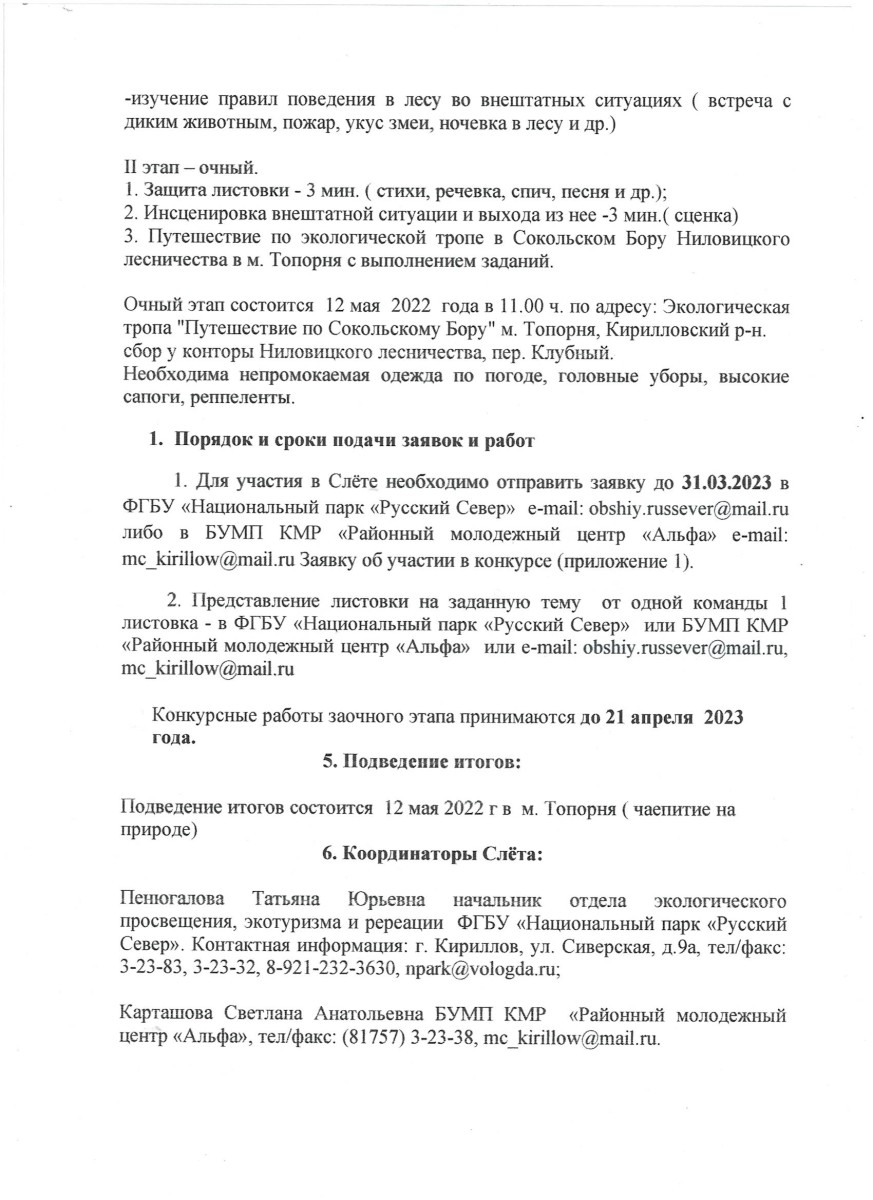 Очный этап пройдет 12 мая в местечке Топорня (экологическая тропа «Путешествие по Сокольскому бору»), ребята защитят подготовленные листовки, покажут инсценировку внештатной ситуации в лесу и выхода из нее. А на десерт предвидится квест — «бродилка» с тематическими заданиями!