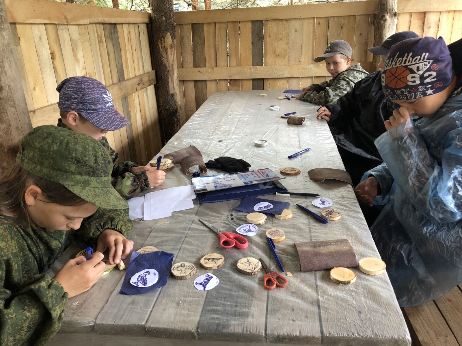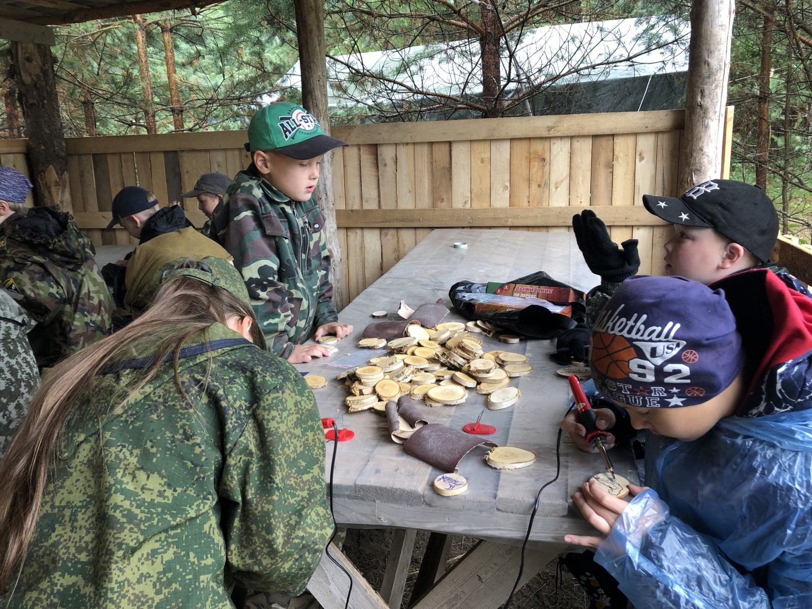 Летний военно-патриотический лагерь "Боец" уже по традиции приезжает на территорию "Русского Севера". В этот год отдел экопросвещения нацпарка провел с детьми занятие по декоративному оформлению спилов дерева: ребята с помощью кальки и карандаша наносили рисунок на поверхность спила, а потом завершали его выжигателем. Так на деревянных кругляшах появлялись птицы "Русского Севера", памятные надписи и многое другое.