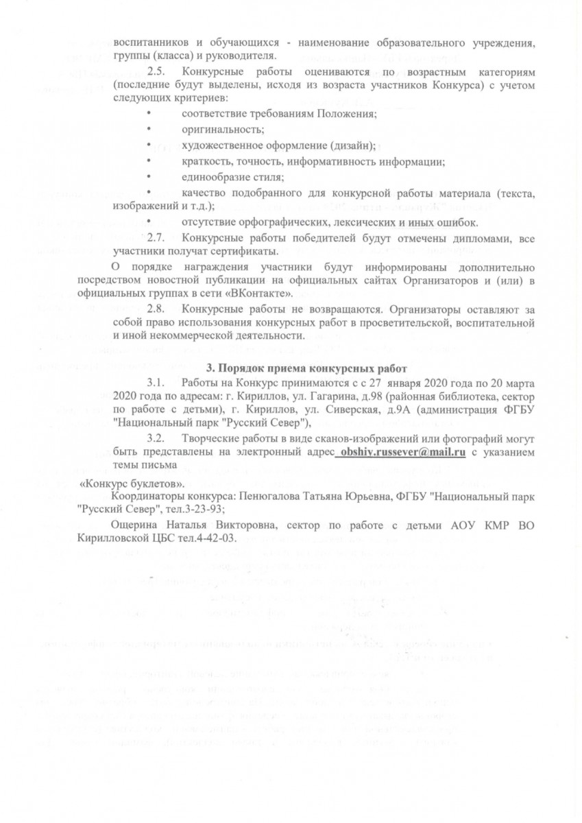 Все желающие могут представить (направить) свои работы по адресам администрации национального парка "Русский Север" (г. Кириллов, ул.Сиверская, д.9А), детского сектора районной Кирилловской библиотеки (г. Кириллов, ул. Гагарина, д.98). Возможен вариант направления сканированного изображения буклета на адрес электронной почты национального парка (obshiy.russever@mail.ru).